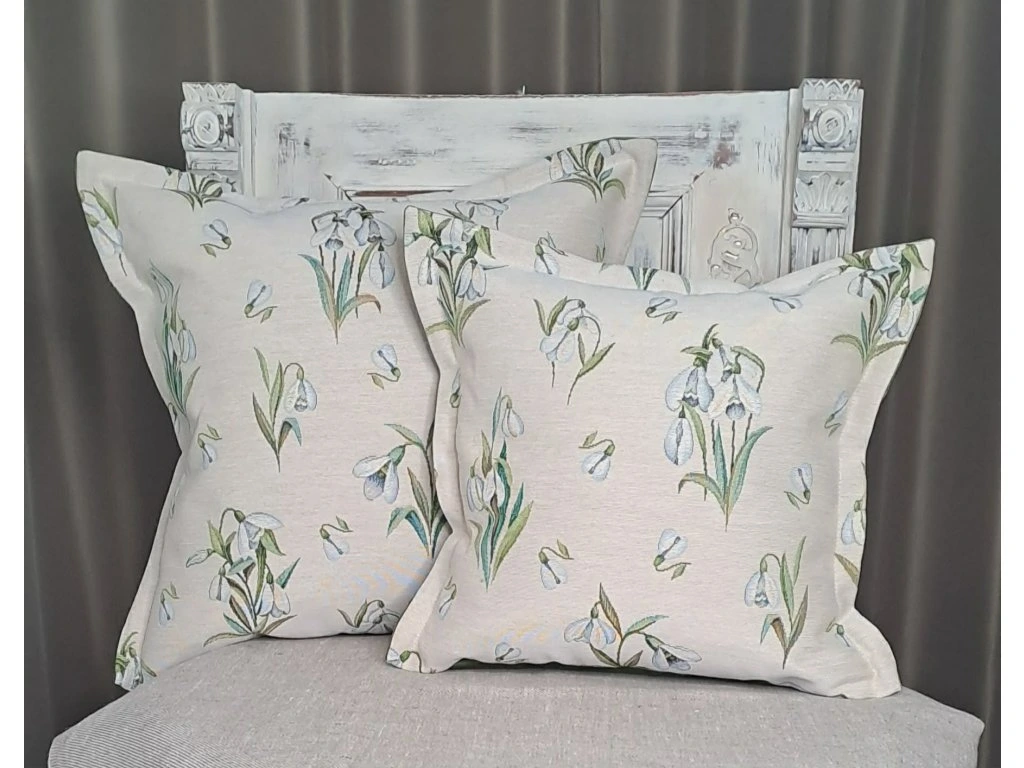 Kvalitní POVLAK na polštář z dekorační látky o rozměru 50x50 cm a 40x40 motivem sněženek. Zadní strana je ze zeleného sametuDodání je možné i včetně vyjímatelné výplně, kterou je nutné objednat zvlášť